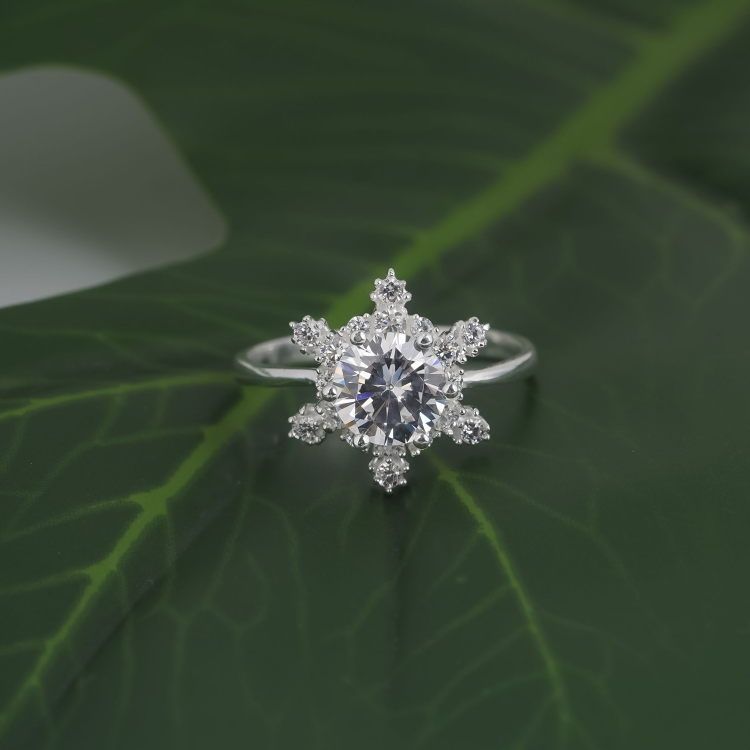 Họa tiết Bông Tuyết: Xung quanh viên đá trung tâm là cấu trúc hình học phức tạp, mô phỏng bông tuyết 6 cánh đang "nở rộ". Các cánh được tạo hình từ bạc tinh xảo, đính thêm các viên đá CZ nhỏ, tạo nên hiệu ứng ánh sáng đa chiều vô cùng bắt mắt.